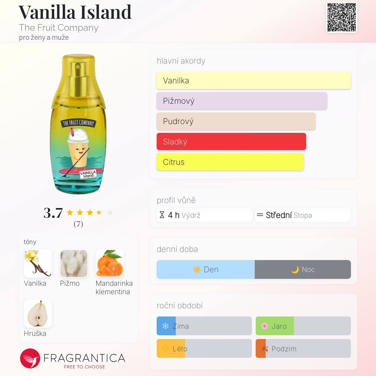 Vanilla Island podle The Fruit Company je vůně pro ženy a muže. Toto je nová vůně. Vanilla Island byl/a uveden/a v roce 2024. Vrchní tón je Vanilka ; střední tóny jsouMandarinka klementina a Hruška ; základní tón je Pižmo.