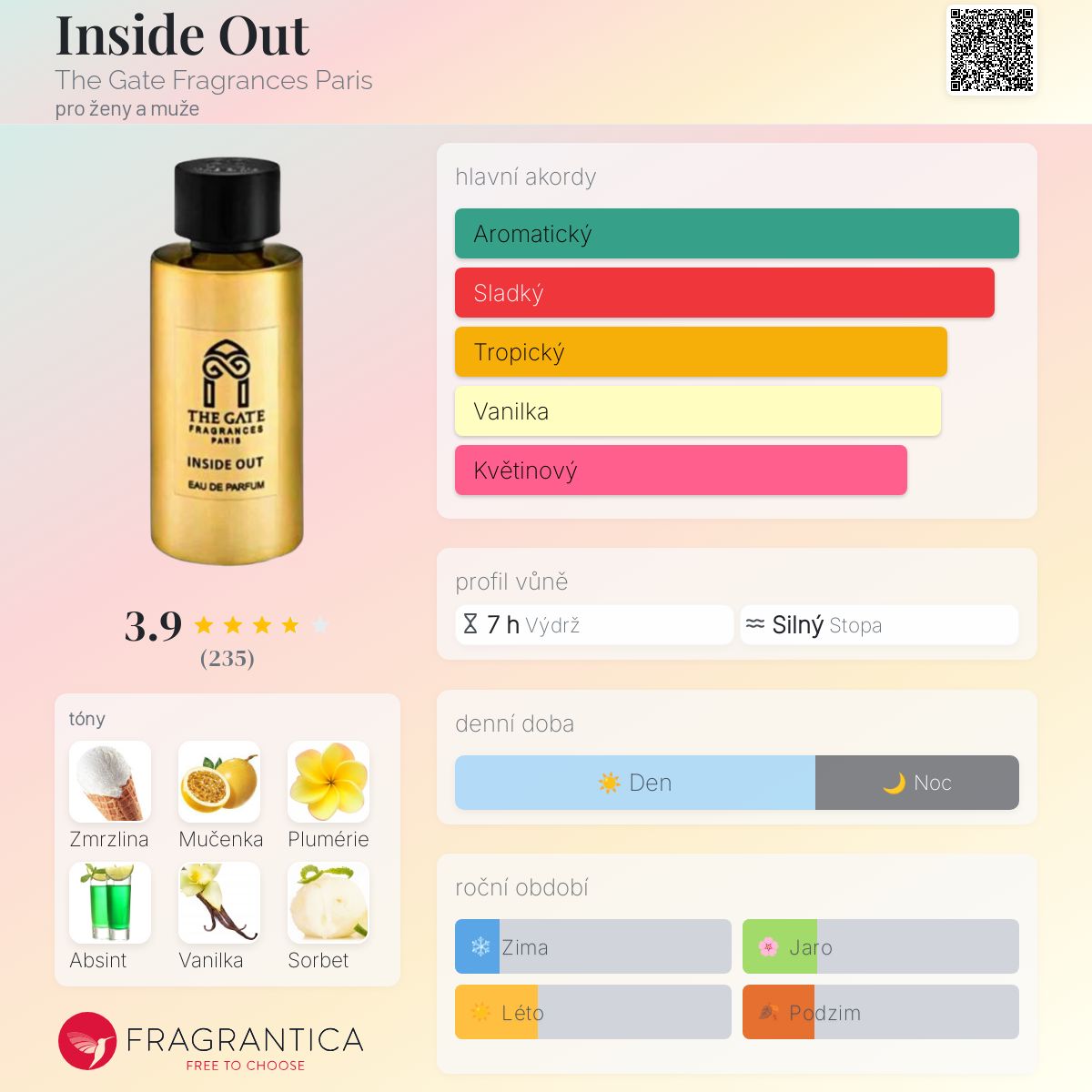Inside Out podle The Gate Fragrances Paris je Orientální vůně pro ženy a muže. Inside Out byl/a uveden/a v roce 2016. Vrchní tóny jsou Mučenka, Sorbet, Bazalka, Černý rybíz a Mandarinka; střední tóny jsouPlumérie, Absint, Rozmarýn, Pelyněk a Magnólie ; základní tóny jsou Zmrzlina a Vanilka.