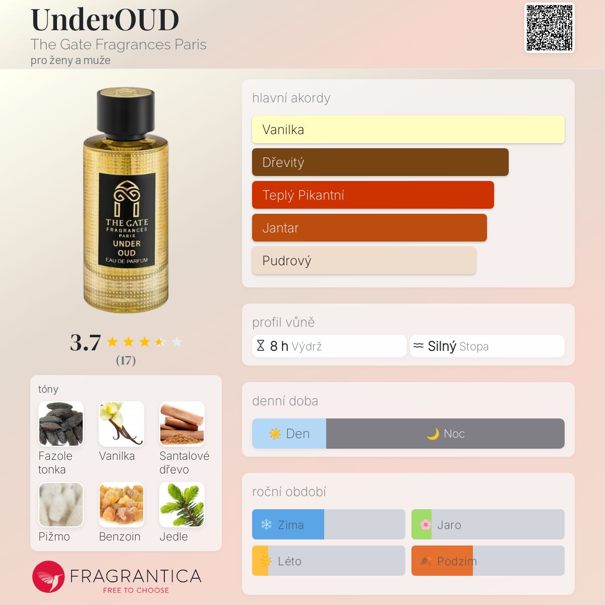 UnderOUD podle The Gate Fragrances Paris je Woody Spicy vůně pro ženy a muže. UnderOUD byl/a uveden/a v roce 2018. Vrchní tóny jsou Pelargónie, Pepř, Olibanum, Švestka a Šalvěj; střední tóny jsouSantalové dřevo, Jedle balzámová, Jedle, Pačuli, Šafrán, Vetiver a Cedr ; základní tóny jsou Fazole tonka, Vanilka, Pižmo, Benzoin, Kastoreum, Agarové dřevo (oud), Guajakové dřevo a Mech.