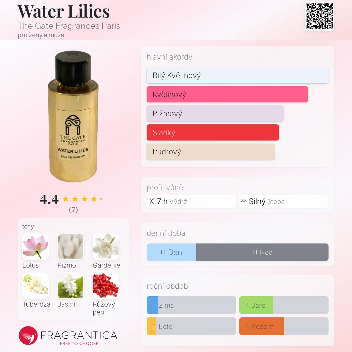 Water Lilies podle The Gate Fragrances Paris je Floral Fruity Gourmand vůně pro ženy a muže. Water Lilies byl/a uveden/a v roce 2015. Vrchní tóny jsou Gardénie, Tuberóza, Růžový pepř, Hruška, Ovocné tóny a Bergamot; střední tóny jsouLotus, Tuberóza, Jasmín, Ylang-Ylang, Koření a Orchidej ; základní tóny jsou Pižmo, Jantar (ambra), Pačuli, Santalové dřevo, Vetiver, Hořká čokoláda a Vanilka.