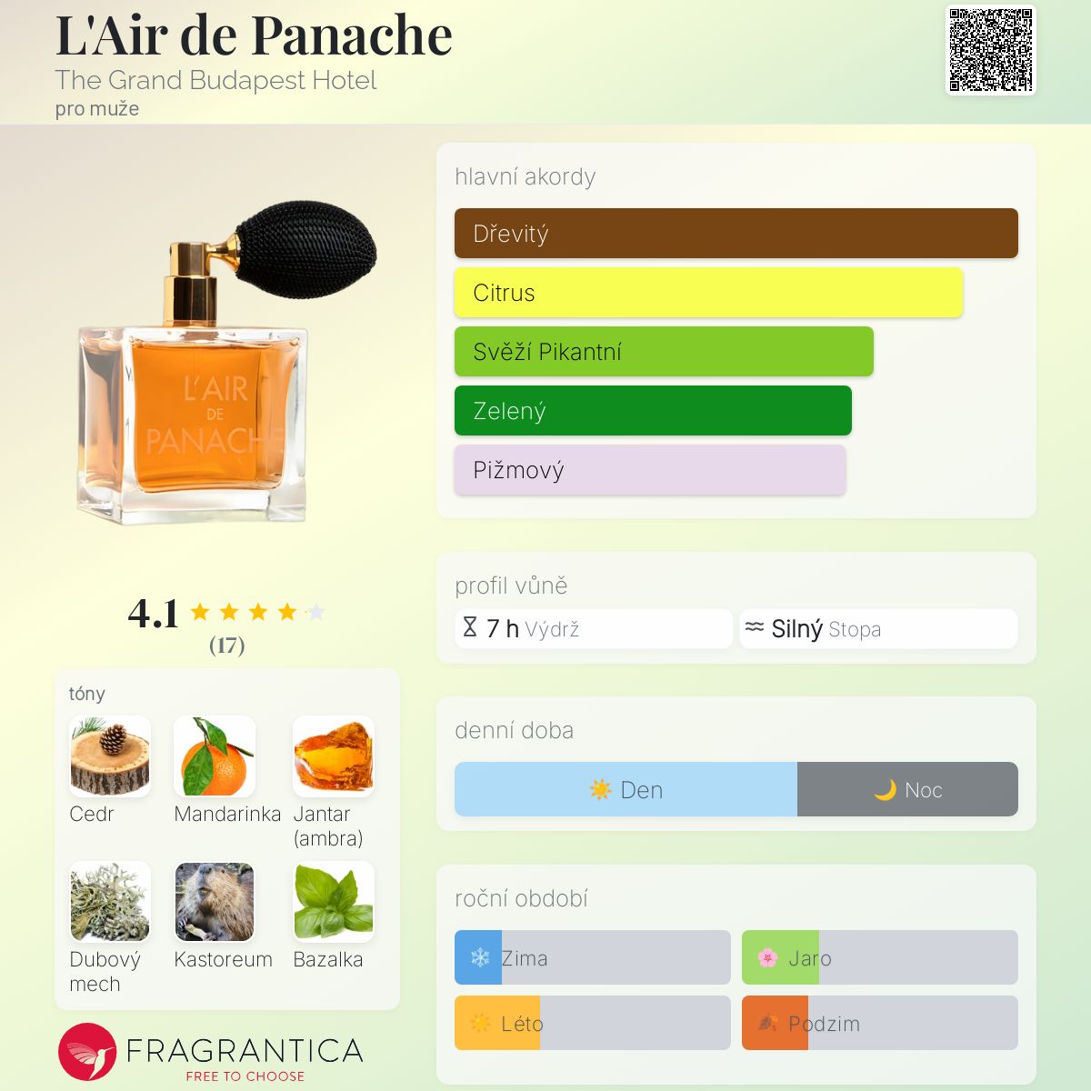 L'Air de Panache podle The Grand Budapest Hotel je Chypre Floral vůně pro muže. L'Air de Panache byl/a uveden/a v roce 2014. "Nosem" za touto vůní je Mark Buxton. Vrchní tóny jsou Mandarinka, Bazalka, Zelené jablko, Bergamot a Petitgrain; střední tóny jsouJasmín Sambac a Růže ; základní tóny jsou Cedr, Jantar (ambra), Dubový mech, Kastoreum, Pačuli a Pižmo.