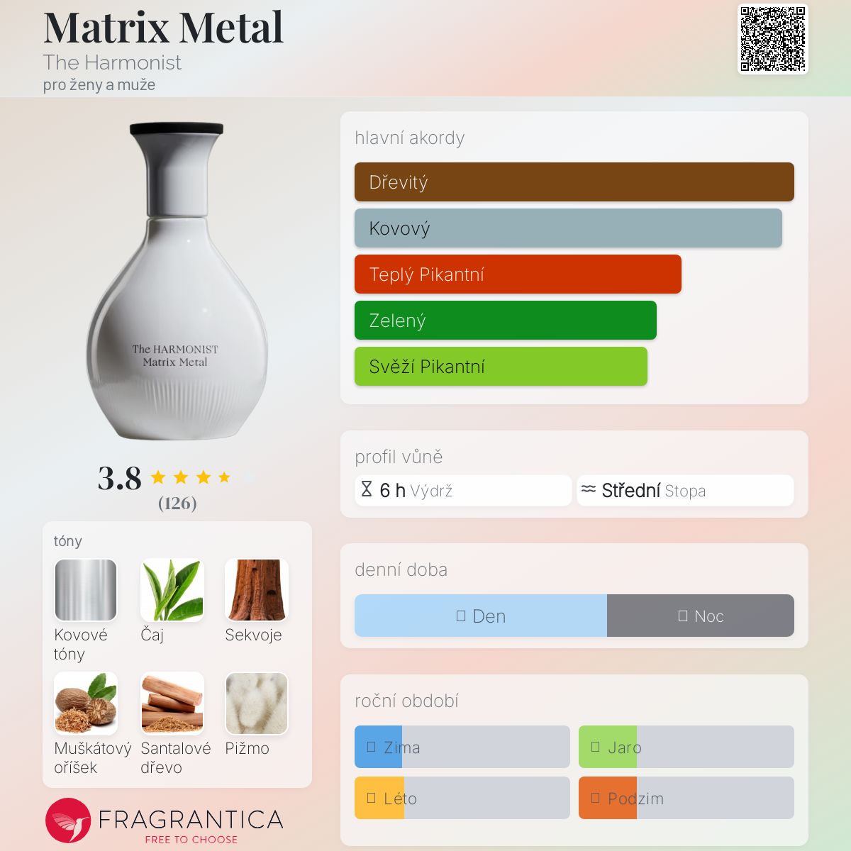 Matrix Metal podle The Harmonist je Aromatic vůně pro ženy a muže. Matrix Metal byl/a uveden/a v roce 2020. Vrchní tóny jsou Kovové tóny, Muškátový oříšek a Kardamom; střední tóny jsouBílý čaj, Brambořík a Vetiver ; základní tóny jsou Sekvoje, Santalové dřevo a Bílé pižmo.