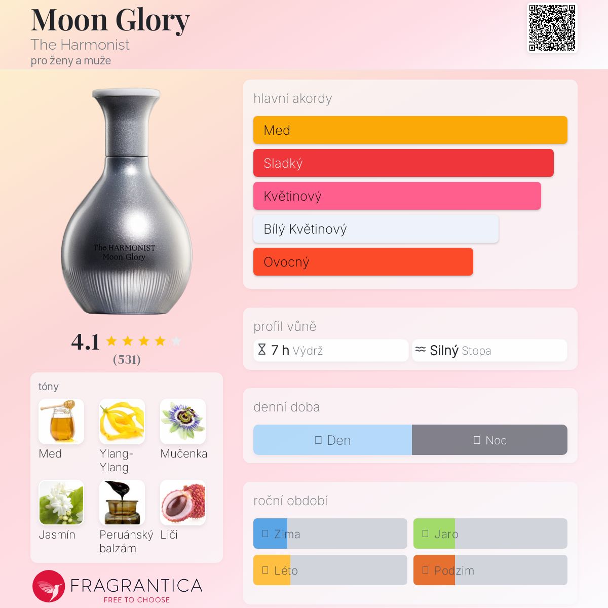 Moon Glory podle The Harmonist je Orientální Floral vůně pro ženy a muže. Moon Glory byl/a uveden/a v roce 2020. "Nosem" za touto vůní je Guillaume Flavigny. Vrchní tóny jsou Ylang-Ylang, Havajský jasmín a Liči; střední tóny jsouMed, Mučenka a Epiphyllum oxypetalum ; základní tóny jsou Peruánský balzám, Bílé pižmo a Dřevo cypřišku tupolistého.