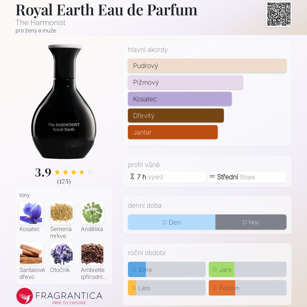 Royal Earth Eau de Parfum podle The Harmonist je Aromatic vůně pro ženy a muže. Royal Earth Eau de Parfum byl/a uveden/a v roce 2016. Vrchní tóny jsou Semena mrkve, Andělika a Ambrette (přírodní pižmo); střední tóny jsouKosatec, Otočník a Neroli ; základní tóny jsou Santalové dřevo, Fazole tonka a Vetiver.