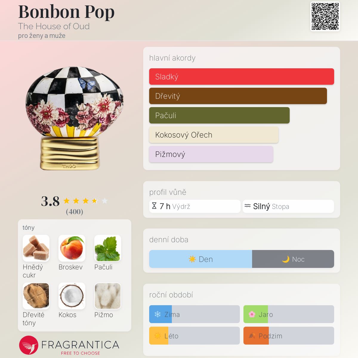 Bonbon Pop podle The House of Oud je Floral Fruity Gourmand vůně pro ženy a muže. Toto je nová vůně. Bonbon Pop byl/a uveden/a v roce 2023. "Nosem" za touto vůní je Douglas Morel. Vrchní tóny jsou Bílá broskev, Kokos a Bergamot; střední tóny jsouPačuli a Jasmín ; základní tóny jsou Hnědý cukr, Vzácné dřevo, Pižmo a Jantar (ambra).
