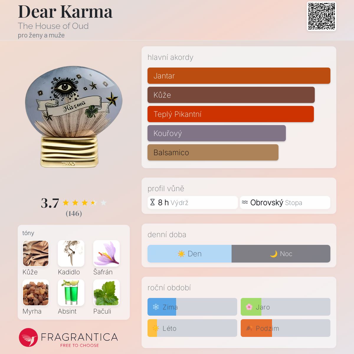 Dear Karma podle The House of Oud je Orientální Woody vůně pro ženy a muže. Toto je nová vůně. Dear Karma byl/a uveden/a v roce 2024. "Nosem" za touto vůní je Cristian Calabro. Vrchní tóny jsou Kadidlo, Absint, Okvětní lístky růží a Neroli; střední tóny jsouŠafrán, Myrha, Pačuli a Cukrové nitě ; základní tóny jsou Kůže, Ambra, Pižmo a Vetiver.
