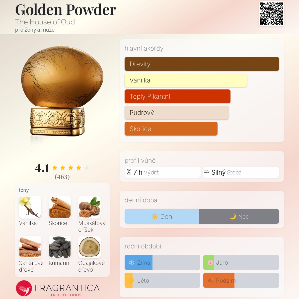Golden Powder podle The House of Oud je Orientální Spicy vůně pro ženy a muže. Golden Powder byl/a uveden/a v roce 2016. Vrchní tóny jsou Skořice a Muškátový oříšek; střední tóny jsouSantalové dřevo, Guajakové dřevo, Virginský cedr a Papyrus ; základní tóny jsou Vanilka, Kumarin, Pižmo, Francouzské labdanum a Tabákový květ.