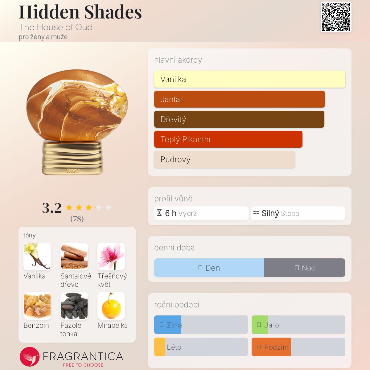 Hidden Shades podle The House of Oud je Woody Floral Musk vůně pro ženy a muže. Hidden Shades byl/a uveden/a v roce 2023. "Nosem" za touto vůní je Maurizio Cerizza. Vrchní tóny jsou Mirabelka, Bergamot a Citrón; střední tóny jsouTřešňový květ, Jasmín a Labdanum ; základní tóny jsou Vanilka, Santalové dřevo, Benzoin, Fazole tonka, Pačuli a Pižmo.