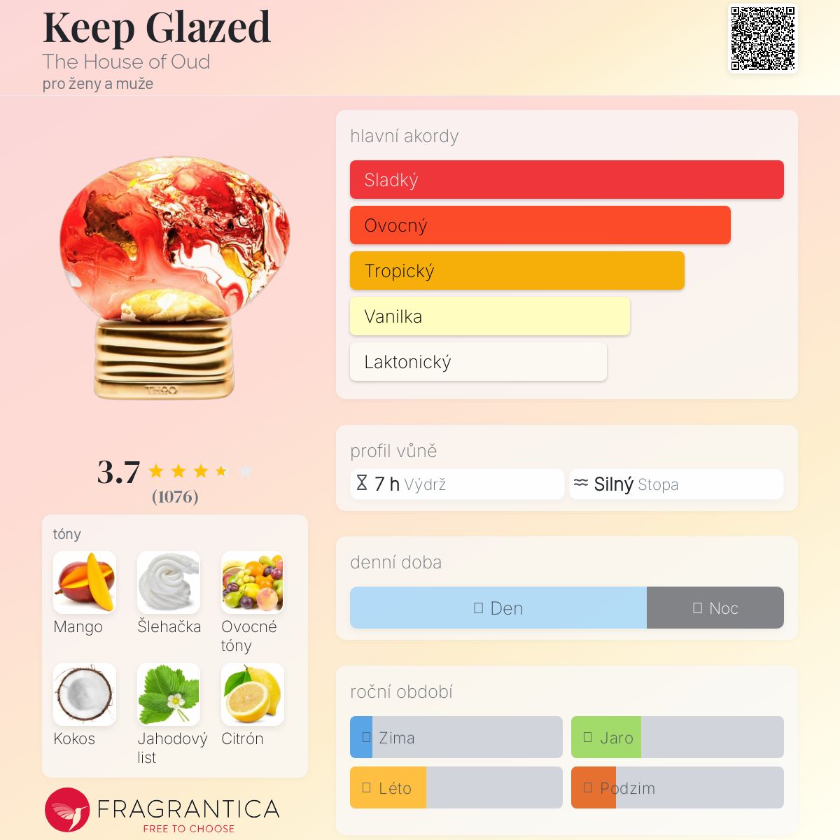 Keep Glazed podle The House of Oud je vůně pro ženy a muže. Keep Glazed byl/a uveden/a v roce 2019. Keep Glazed byl/a vytvořen/a Cristian Calabro a Andrea (Thero) Casotti. Vrchní tóny jsou Mango, Jahodový list a Ledový citrón; střední tóny jsouŠlehačka, Kokos a Zázvor ; základní tóny jsou Ovocné tóny, Pižmo a Vzácné dřevo.