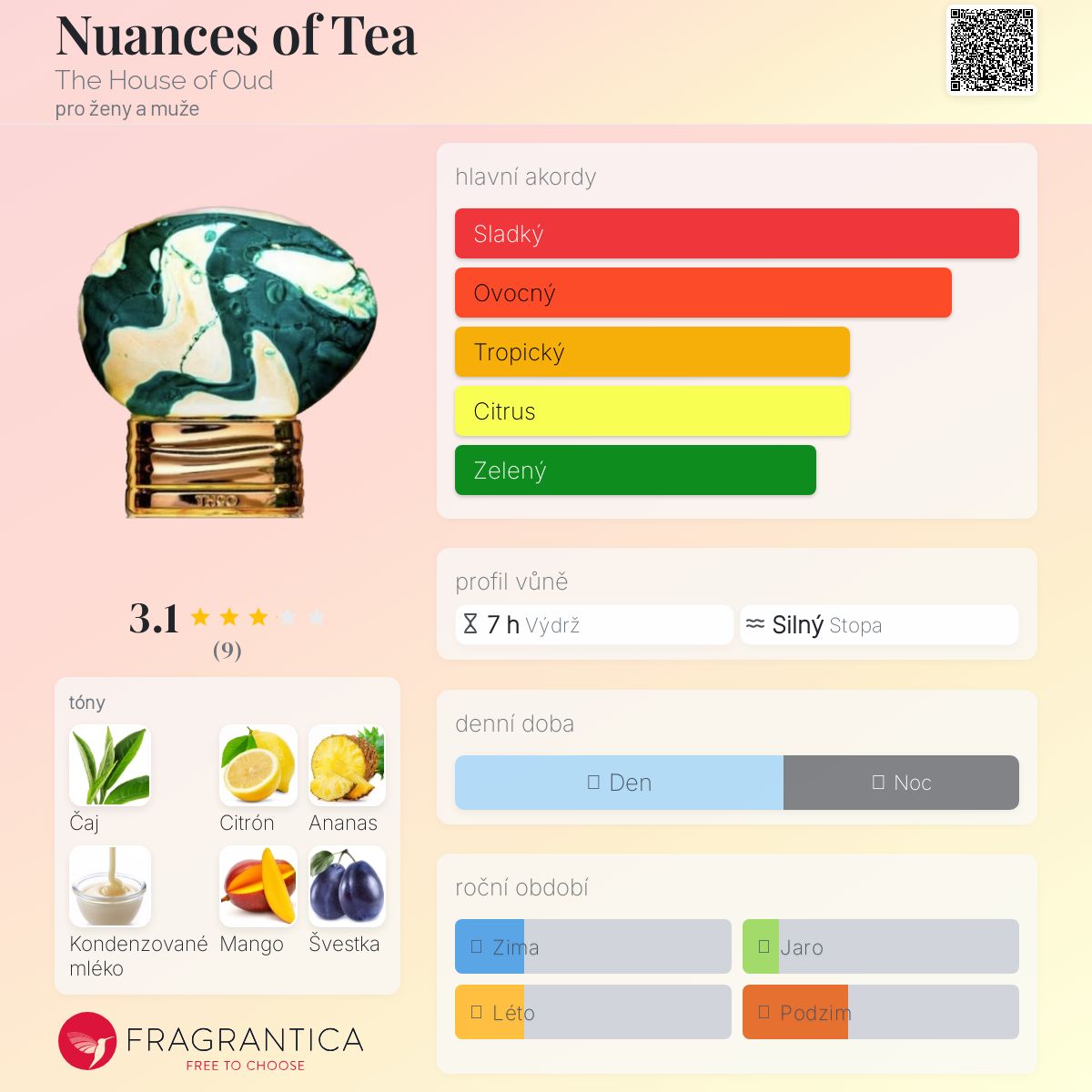 Nuances of Tea podle The House of Oud je Citrus Gourmand vůně pro ženy a muže. Toto je nová vůně. Nuances of Tea byl/a uveden/a v roce 2025. Vrchní tóny jsou Citronová kůra, Ananas a Švestka; střední tóny jsouZelený čaj, Kondenzované mléko a Zelené mango ; základní tóny jsou Cedr, Vetiver a Jantar (ambra).