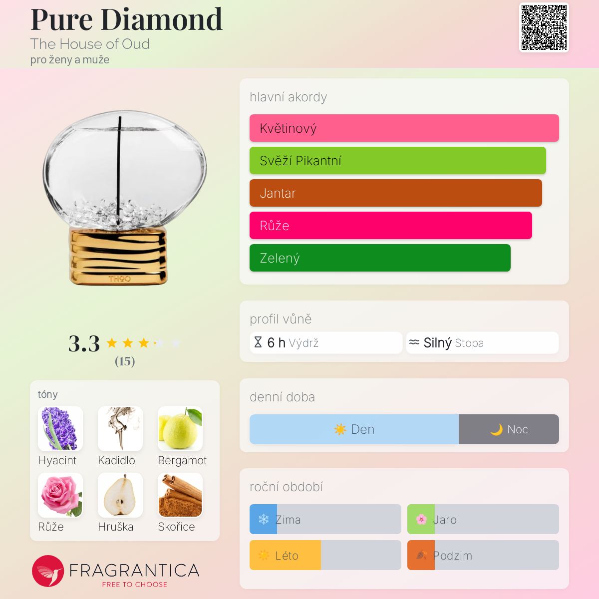 Pure Diamond podle The House of Oud je Orientální Floral vůně pro ženy a muže. Toto je nová vůně. Pure Diamond byl/a uveden/a v roce 2025. "Nosem" za touto vůní je Cristian Calabro. Vrchní tóny jsou Bergamot, Kadidlo, Hruška a Růžový pepř; střední tóny jsouHyacint, Růže, Skořice a Muškátový oříšek ; základní tóny jsou Bílé pižmo, Ambra a Santalové dřevo.