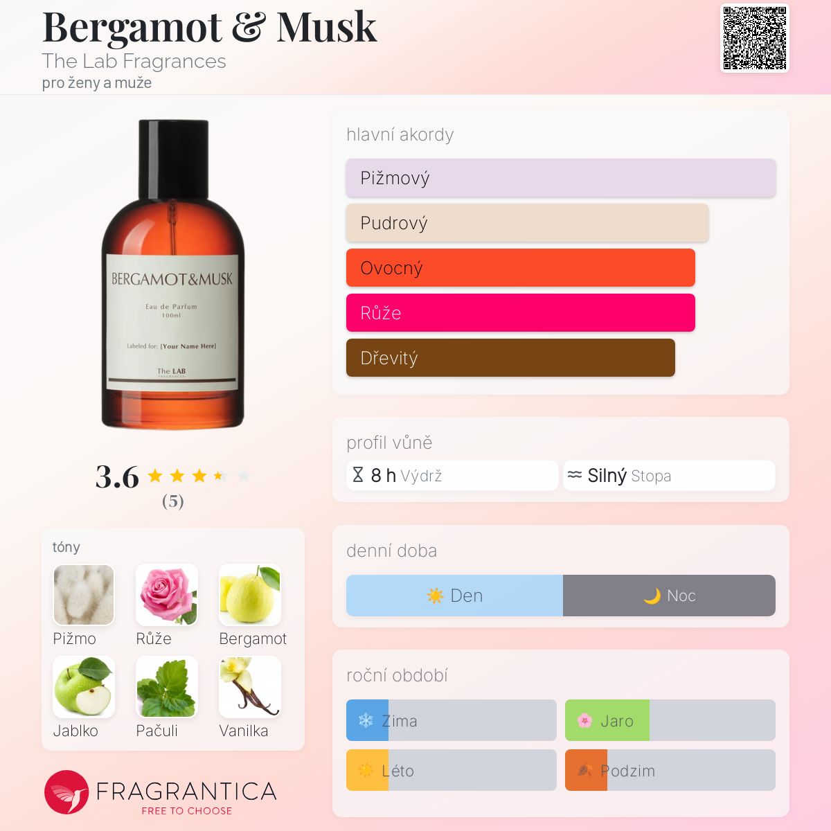 Bergamot & Musk podle The Lab Fragrances je Floral Woody Musk vůně pro ženy a muže. Bergamot & Musk byl/a uveden/a v roce 2018. Vrchní tóny jsou Bergamot, Jablko a Černý rybíz; střední tóny jsouRůže, Pačuli, Jasmín a Bříza ; základní tóny jsou Bílé pižmo, Vanilka, Jantar (ambra) a Dubový mech.