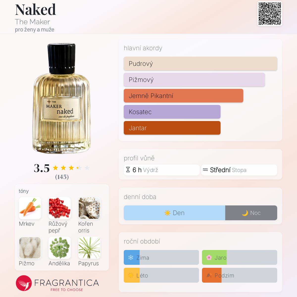 Naked podle The Maker je Orientální vůně pro ženy a muže. Naked byl/a uveden/a v roce 2021. Vrchní tóny jsou Růžový pepř, Andělika a Mandarinka; střední tóny jsouMrkev, Orris a Brambořík ; základní tóny jsou Bílé pižmo, Papyrus a Křišťálový jantar.