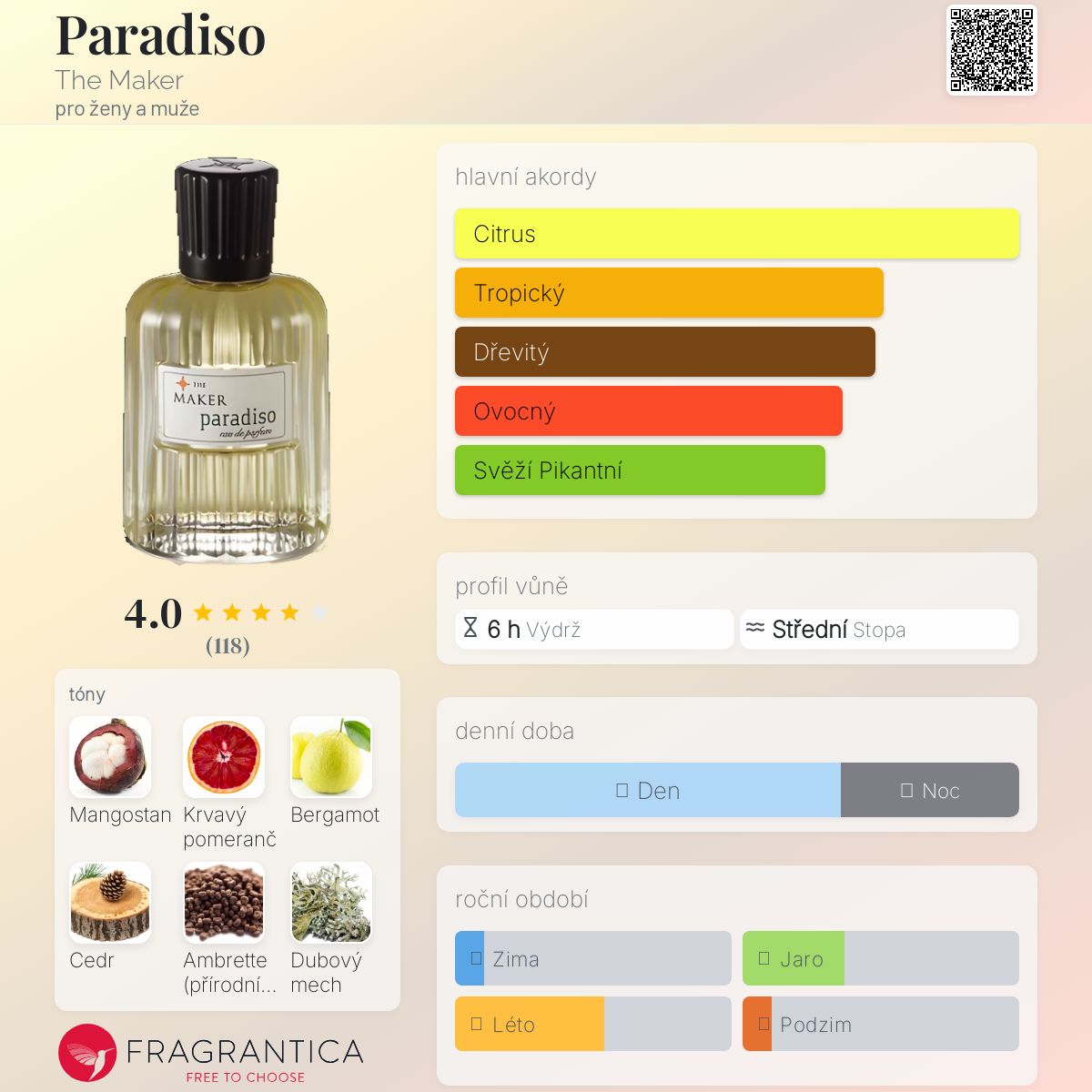 Paradiso podle The Maker je Floral Fruity vůně pro ženy a muže. Paradiso byl/a uveden/a v roce 2021. Vrchní tóny jsou Mangostan, Krvavý pomeranč a Sicilský bergamot; střední tóny jsouAmbrette (přírodní pižmo), Plumérie a Myrta ; základní tóny jsou Marocký cedr, Dubový mech a List pačuli.