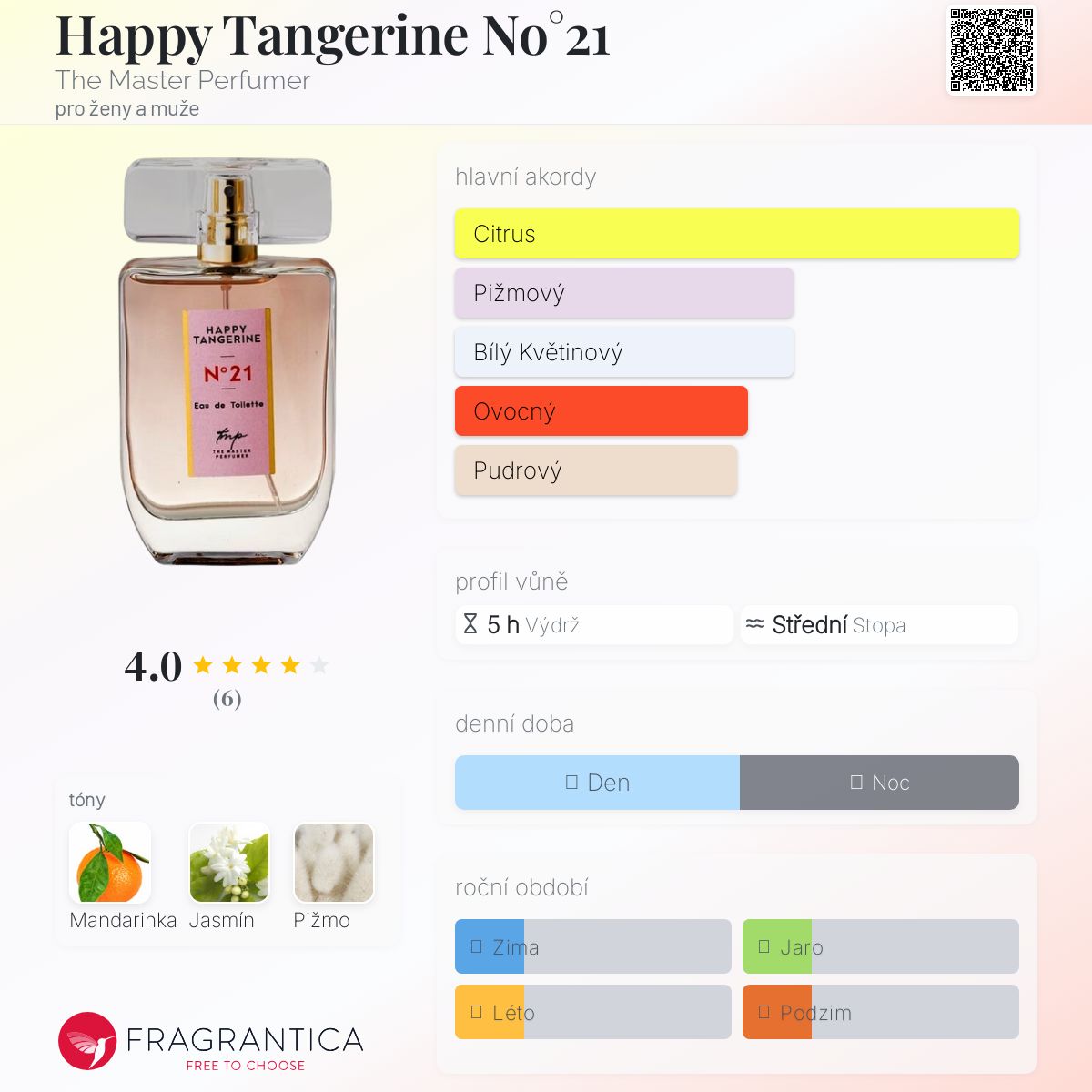 Happy Tangerine No°21 podle The Master Perfumer je Floral Fruity vůně pro ženy a muže. Happy Tangerine No°21 byl/a uveden/a v roce 2021. Vrchní tón je Mandarinka ; střední tón jeJasmín ; základní tón je Pižmo.