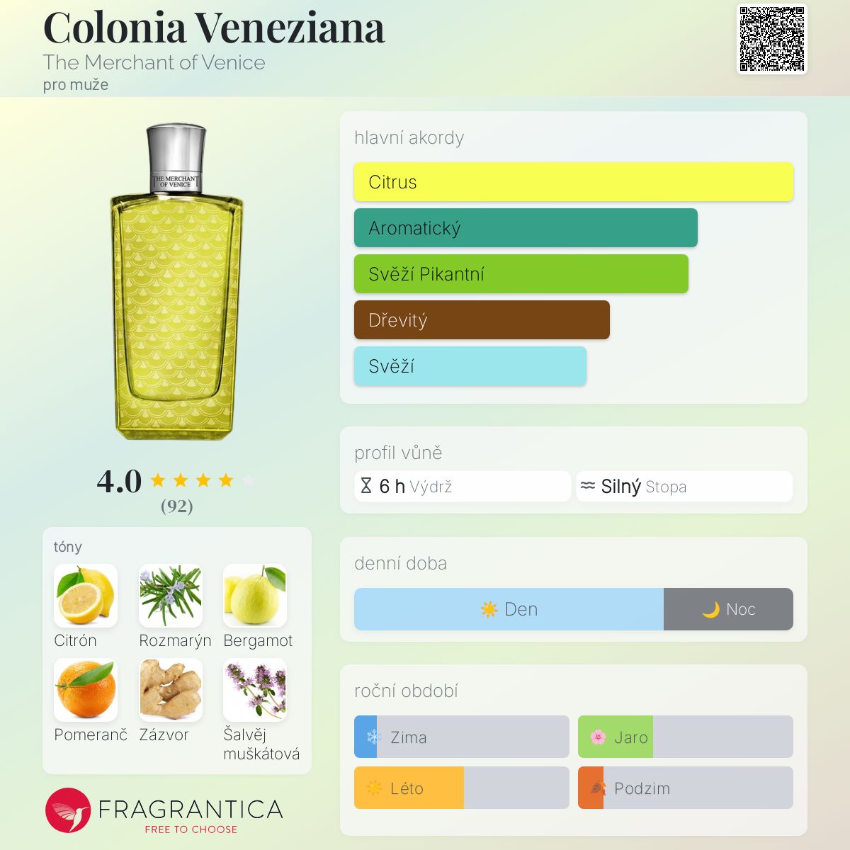 Colonia Veneziana podle The Merchant of Venice je Citrus Aromatic vůně pro muže. Colonia Veneziana byl/a uveden/a v roce 2020. Vrchní tóny jsou Citrón, Rozmarýn, Bergamot a Pomeranč; střední tóny jsouZázvor, Šalvěj muškátová a Kosatec ; základní tóny jsou Cedr a Pižmo.