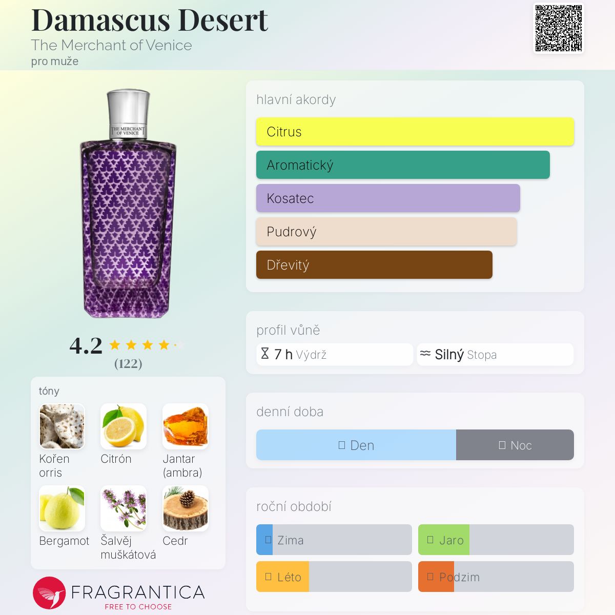 Damascus Desert podle The Merchant of Venice je Woody Aromatic vůně pro muže. Damascus Desert byl/a uveden/a v roce 2020. Vrchní tóny jsou Citrón, Bergamot a Zázvor; střední tóny jsouOrris, Šalvěj muškátová a Pelargónie ; základní tóny jsou Jantar (ambra), Cedr, Pižmo a Vetiver.