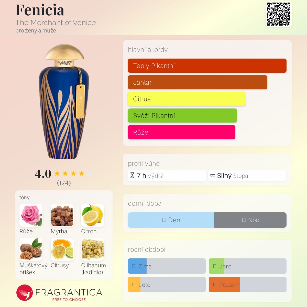 Fenicia podle The Merchant of Venice je Orientální Spicy vůně pro ženy a muže. Fenicia byl/a uveden/a v roce 2015. Vrchní tóny jsou Citrón a Elimi; střední tóny jsouRůže, Myrha, Muškátový oříšek, Olibanum, Hřebíček a Skořice ; základní tóny jsou Citrusy, Santalové dřevo, Benzoin, Šafrán, Fazole tonka a Pačuli.