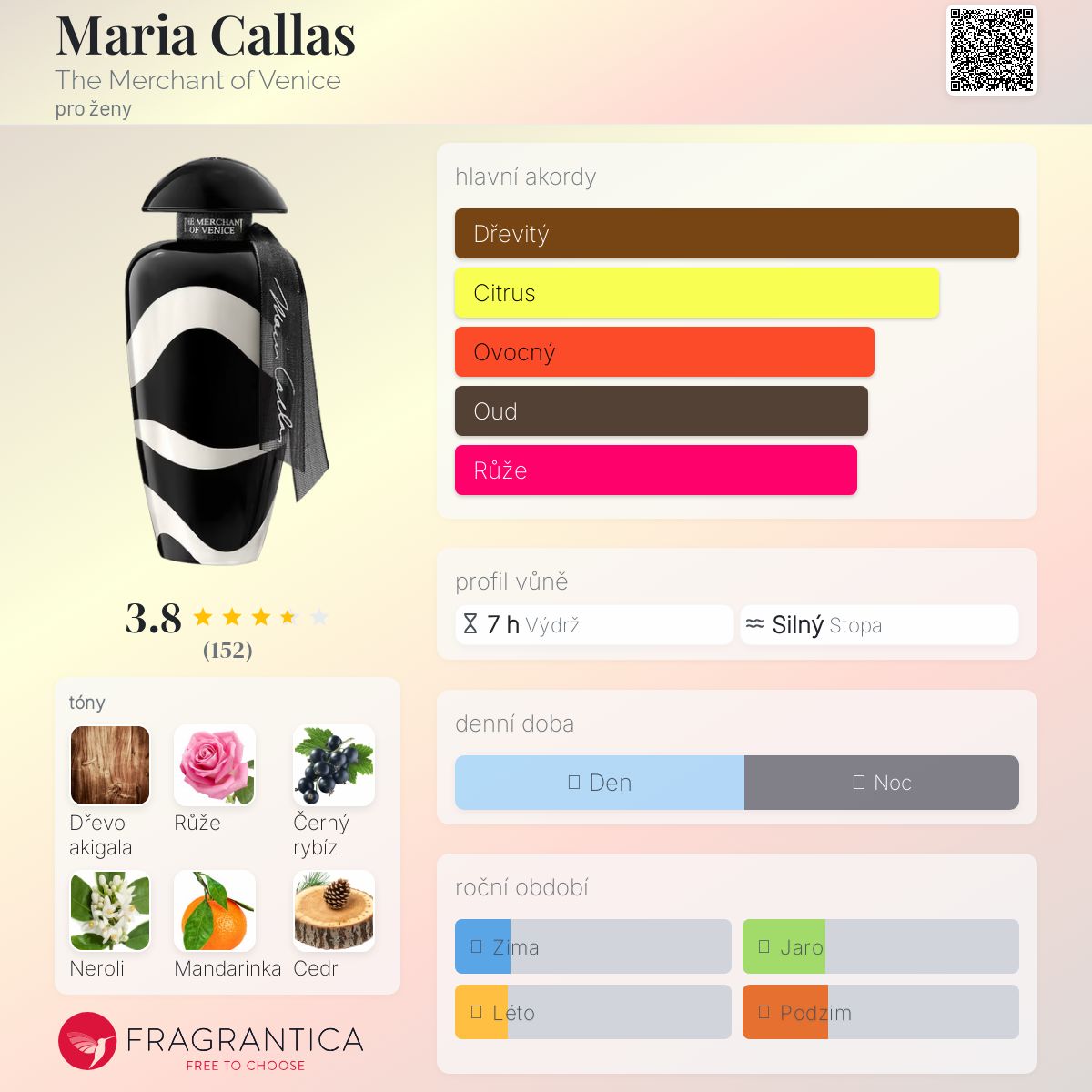 Maria Callas podle The Merchant of Venice je vůně pro ženy. Maria Callas byl/a uveden/a v roce 2023. Maria Callas byl/a vytvořen/a Yann Vasnier a Olivier Pescheux. Vrchní tóny jsou Italská mandarinka, Černý pepř a Citrón; střední tóny jsouRůže, Černý rybíz, Neroli a Zelené tóny ; základní tóny jsou Dřevo akigala, Texaský cedr, Virginský cedr a Georgywood.