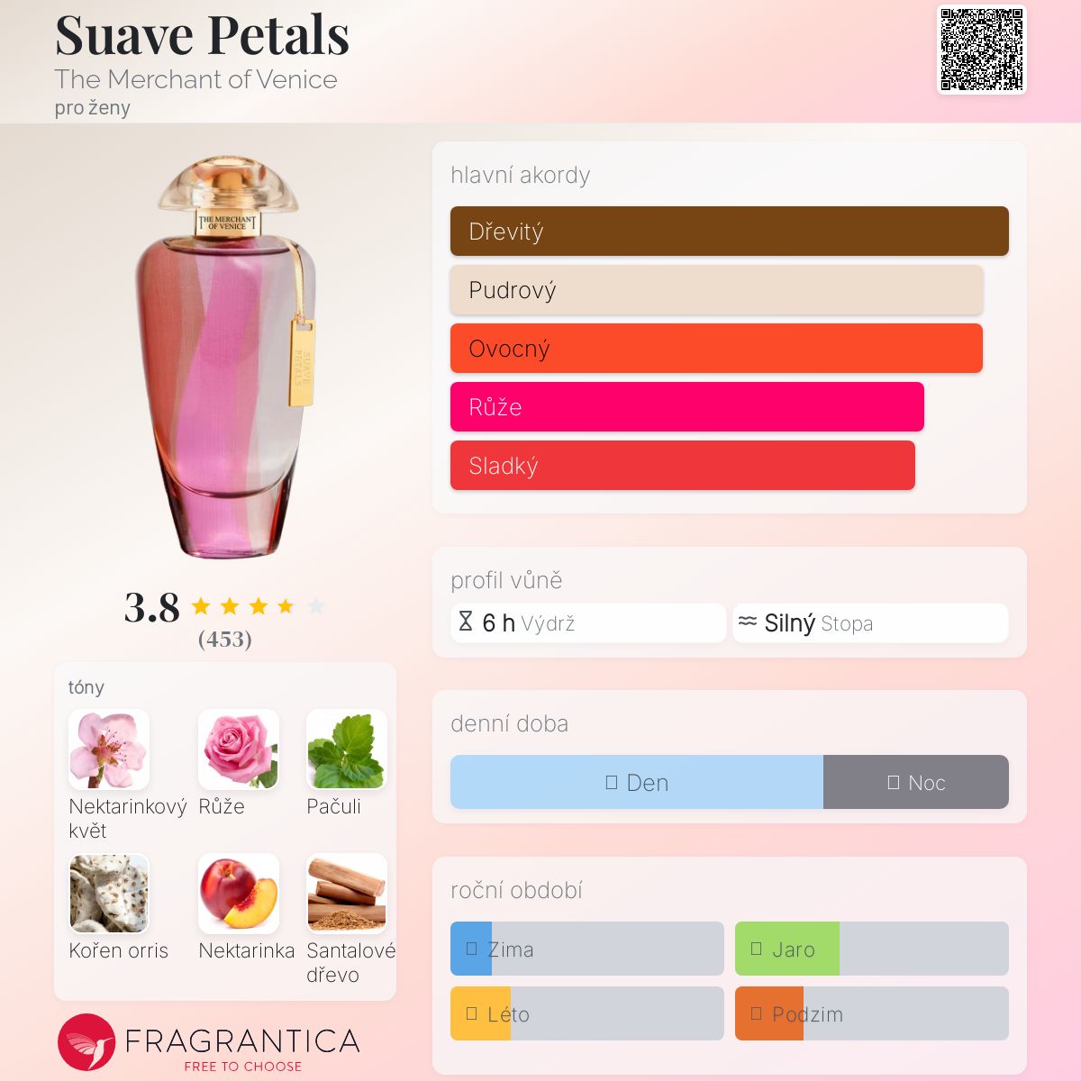 Suave Petals podle The Merchant of Venice je Floral vůně pro ženy. Suave Petals byl/a uveden/a v roce 2013. Vrchní tóny jsou Nektarinkový květ, Nektarinka, Ananas, Jablko a Bergamot; střední tóny jsouBílá růže, Orris, Pomerančový květ a Tuberóza ; základní tóny jsou Pačuli, Santalové dřevo, Vanilka a Jantar (ambra).