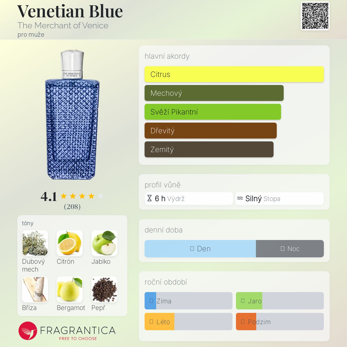 Venetian Blue podle The Merchant of Venice je Orientální Woody vůně pro muže. Venetian Blue byl/a uveden/a v roce 2016. Vrchní tóny jsou Citrón, Jablko a Bergamot; střední tóny jsouBříza, Černý pepř a Pačuli ; základní tóny jsou Mech, Ambra a Pižmo.