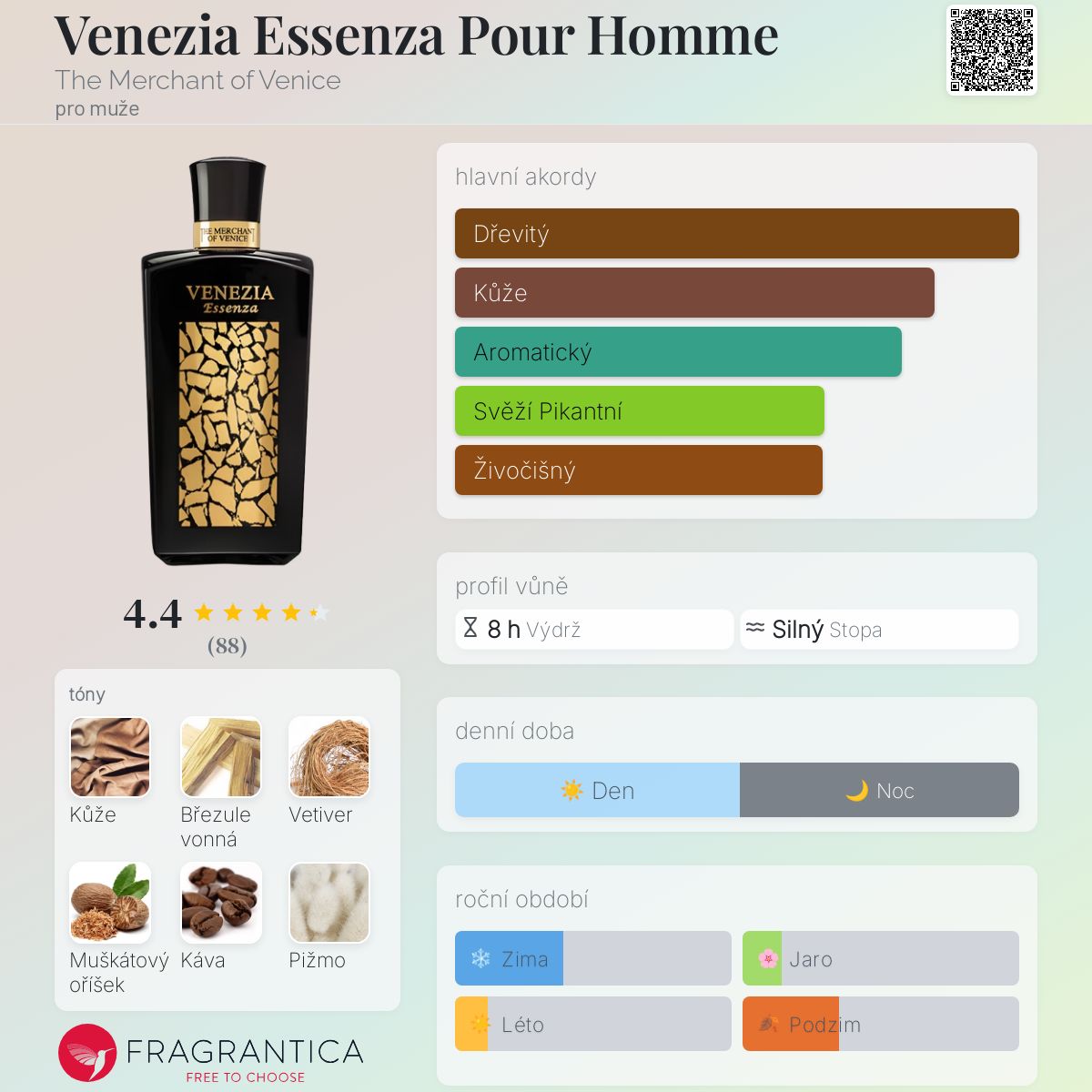Venezia Essenza Pour Homme podle The Merchant of Venice je Leather vůně pro muže. Venezia Essenza Pour Homme byl/a uveden/a v roce 2017.
