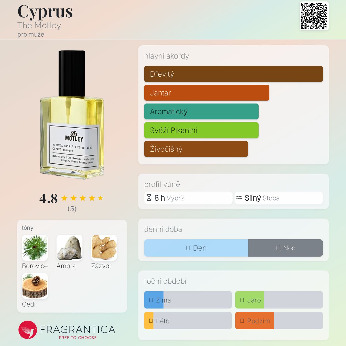 Cyprus podle The Motley je Chypre vůně pro muže. Cyprus byl/a uveden/a v roce 2014. "Nosem" za touto vůní je Jacqueline Steele.