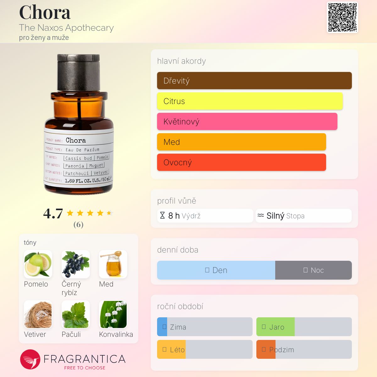 Chora podle The Naxos Apothecary je Floral Fruity vůně pro ženy a muže. Chora byl/a uveden/a v roce 2019. Vrchní tóny jsou Pomelo, Černý rybíz a Med; střední tóny jsouKonvalinka a Pivoňka ; základní tóny jsou Vetiver a Pačuli.