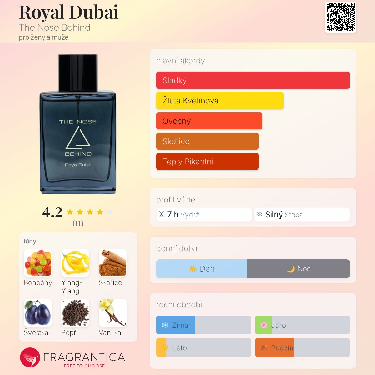 Royal Dubai podle The Nose Behind je Orientální Floral vůně pro ženy a muže. Toto je nová vůně. Royal Dubai byl/a uveden/a v roce 2024. Vrchní tóny jsou Ylang-Ylang, Skořice a Černý pepř; střední tóny jsouŠvestka, Atlasový cedr, Pačuli a Fialka ; základní tóny jsou Sladké tóny, Vanilka a Pižmo.