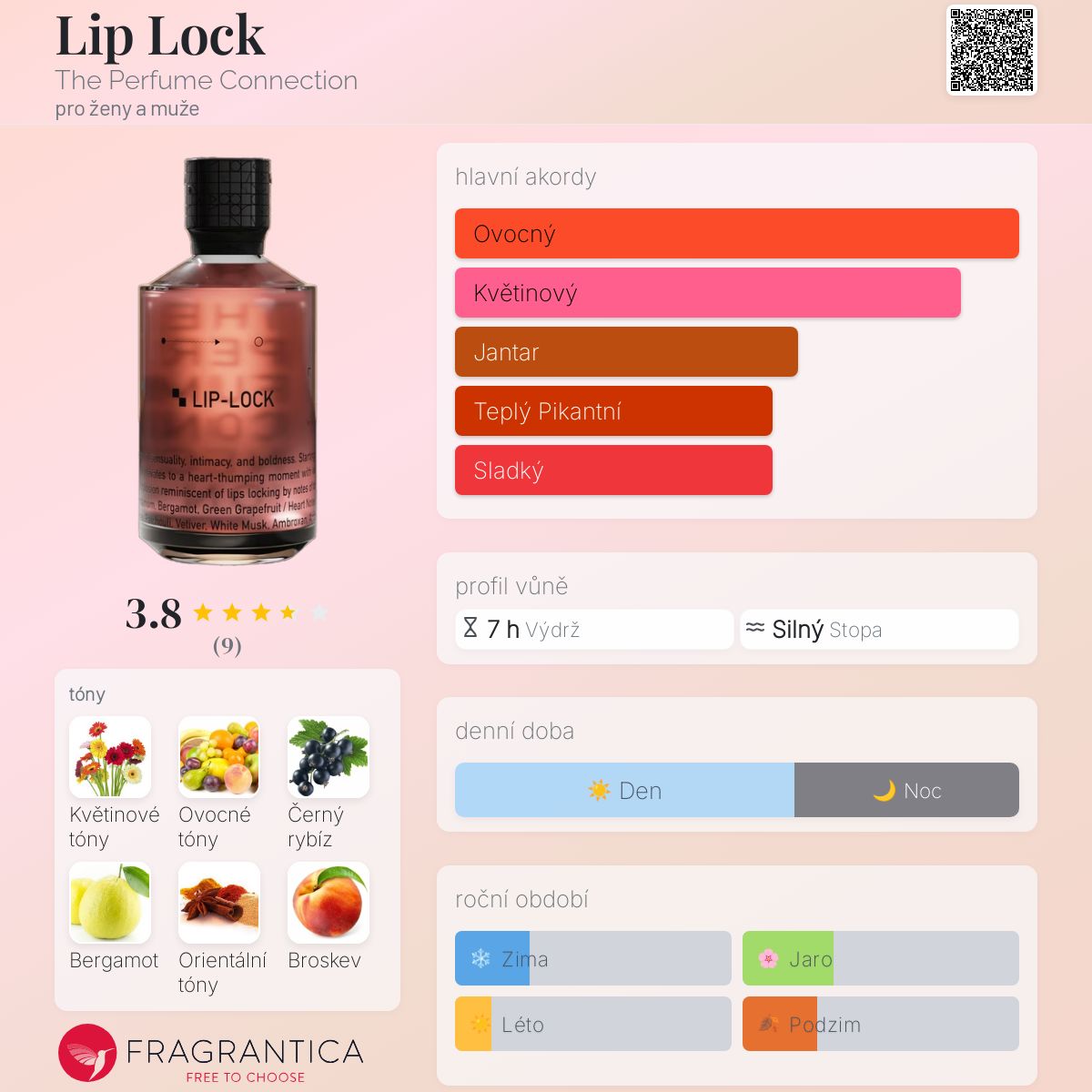 Lip Lock podle The Perfume Connection je vůně pro ženy a muže. Lip Lock byl/a uveden/a v roce 2023. "Nosem" za touto vůní je Asem Al Qassim. Vrchní tóny jsou Exotické ovoce, Černý rybíz, Bergamot a Orientální tóny; střední tóny jsouKvětinové tóny, Bílá broskev, Vonokvětka a Jantar (ambra) ; základní tóny jsou Pačuli, Tuberóza, Semiš a Vanilkový květ.