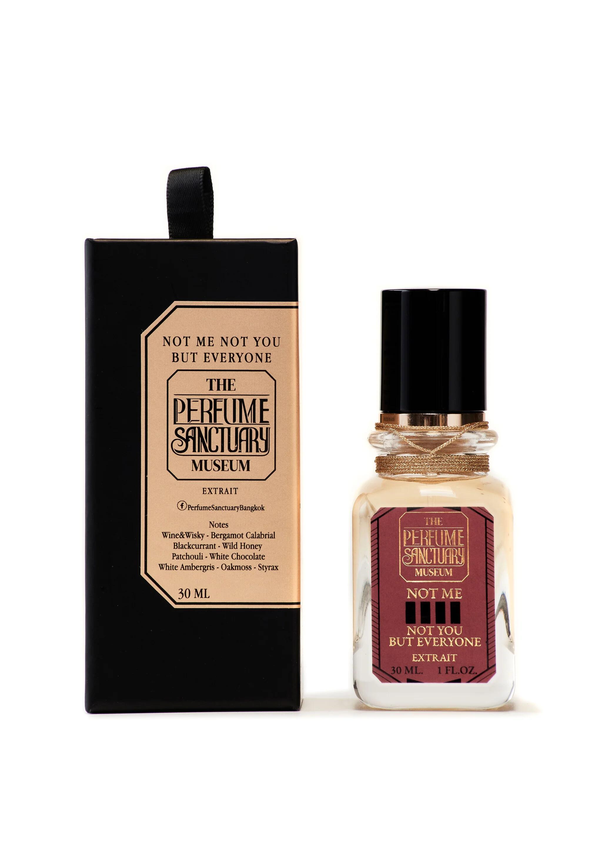 Not Me Not You But Everyone podle The Perfume Sanctuary je Chypre vůně pro ženy a muže. Toto je nová vůně. Not Me Not You But Everyone byl/a uveden/a v roce 2025. "Nosem" za touto vůní je Anucha Boonyawatana. Vrchní tóny jsou Palisandr, Červené víno, Hořký pomeranč, Whisky, Petitgrain a Bergamot; střední tóny jsouBílá čokoláda, Med a Černý rybíz ; základní tóny jsou Styrax, Pačuli, Ambra a Dubový mech.