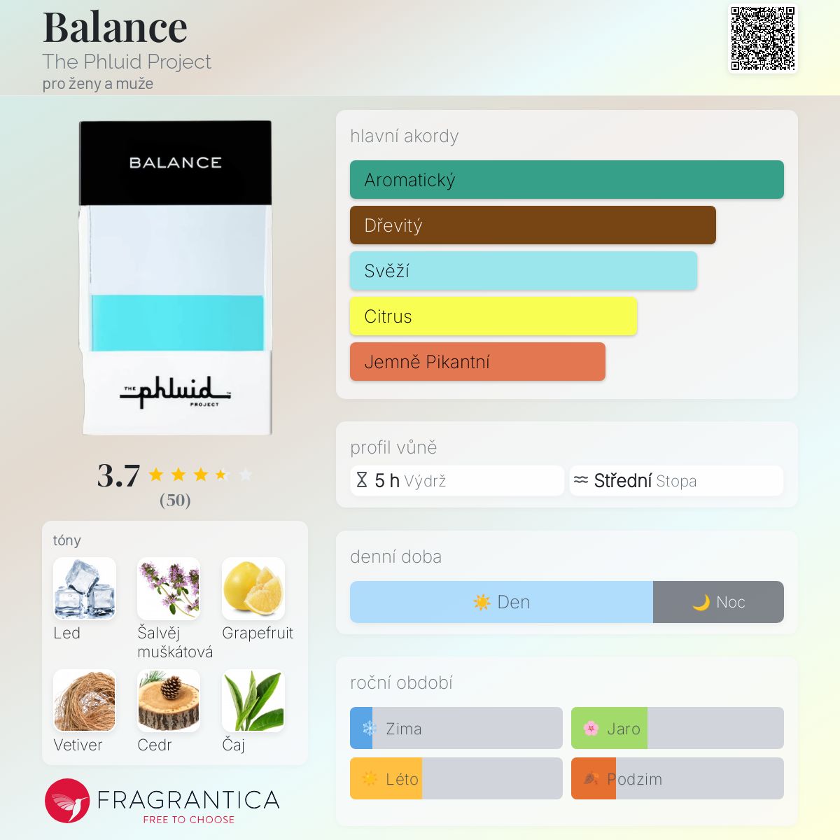 Balance podle The Phluid Project je Woody Aromatic vůně pro ženy a muže. Balance byl/a uveden/a v roce 2020. Vrchní tóny jsou Led, Grapefruit a Kardamom; střední tóny jsouŠalvěj muškátová a Černý čaj ; základní tóny jsou Vetiver a Atlasový cedr.