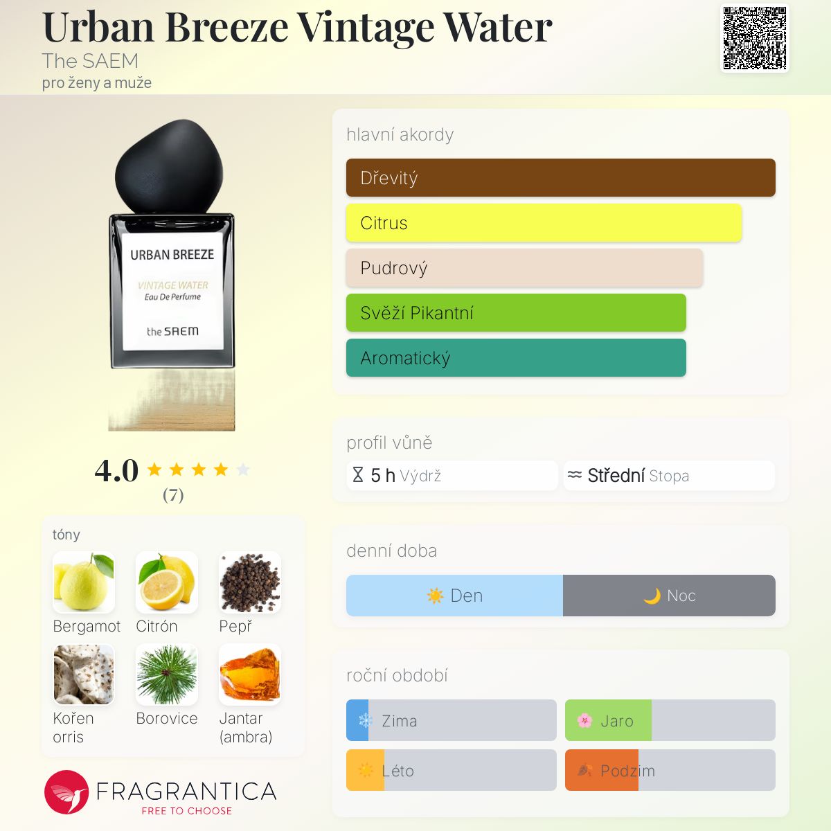 Urban Breeze Vintage Water podle The SAEM je Aromatic vůně pro ženy a muže. Urban Breeze Vintage Water byl/a uveden/a v roce 2017. Vrchní tóny jsou Bergamot, Citrón a Pepř; střední tóny jsouOrris a Jehličí borovice ; základní tóny jsou Jantar (ambra), Vanilka a Santalové dřevo.