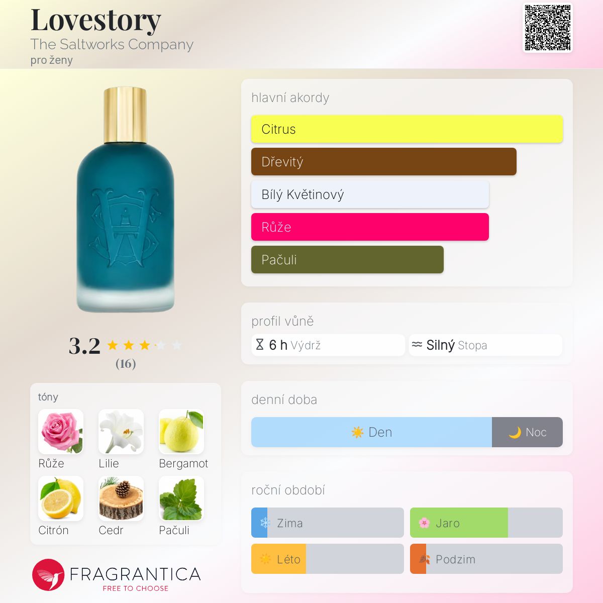 Lovestory podle The Saltworks Company je vůně pro ženy. Vrchní tóny jsou Bergamot a Citrón; střední tóny jsouDamašská růže, Růže a Lilie ; základní tóny jsou Cedr a Pačuli.