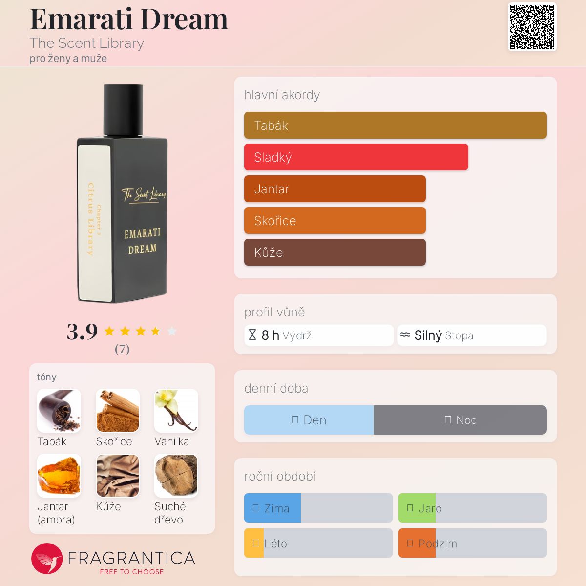 Emarati Dream podle The Scent Library je Leather vůně pro ženy a muže. Emarati Dream byl/a uveden/a v roce 2023. "Nosem" za touto vůní je Saeed AlNuaimi. Vrchní tóny jsou Skořice a Ovocné tóny; střední tóny jsouTabák, Vanilka, Jantar (ambra) a Kadidlo ; základní tóny jsou Kůže, Suché dřevo a Mech.