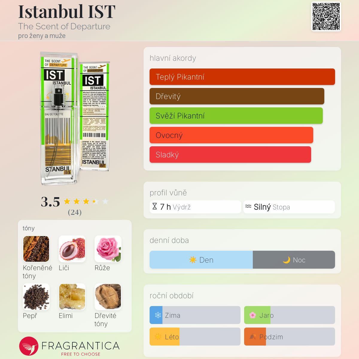 Istanbul IST podle The Scent of Departure je Orientální Spicy vůně pro ženy a muže. Istanbul IST byl/a uveden/a v roce 2011. "Nosem" za touto vůní je Gerald Ghislain. Vrchní tóny jsou Koření, Elimi, Bergamot, Červené bobule a Grapefruit; střední tóny jsouLiči, Růže, Pepř, Sladké tóny, Lotus, Maliny a Fialka ; základní tóny jsou Dřevité tóny, Santalové dřevo, Skořice a Pižmo.