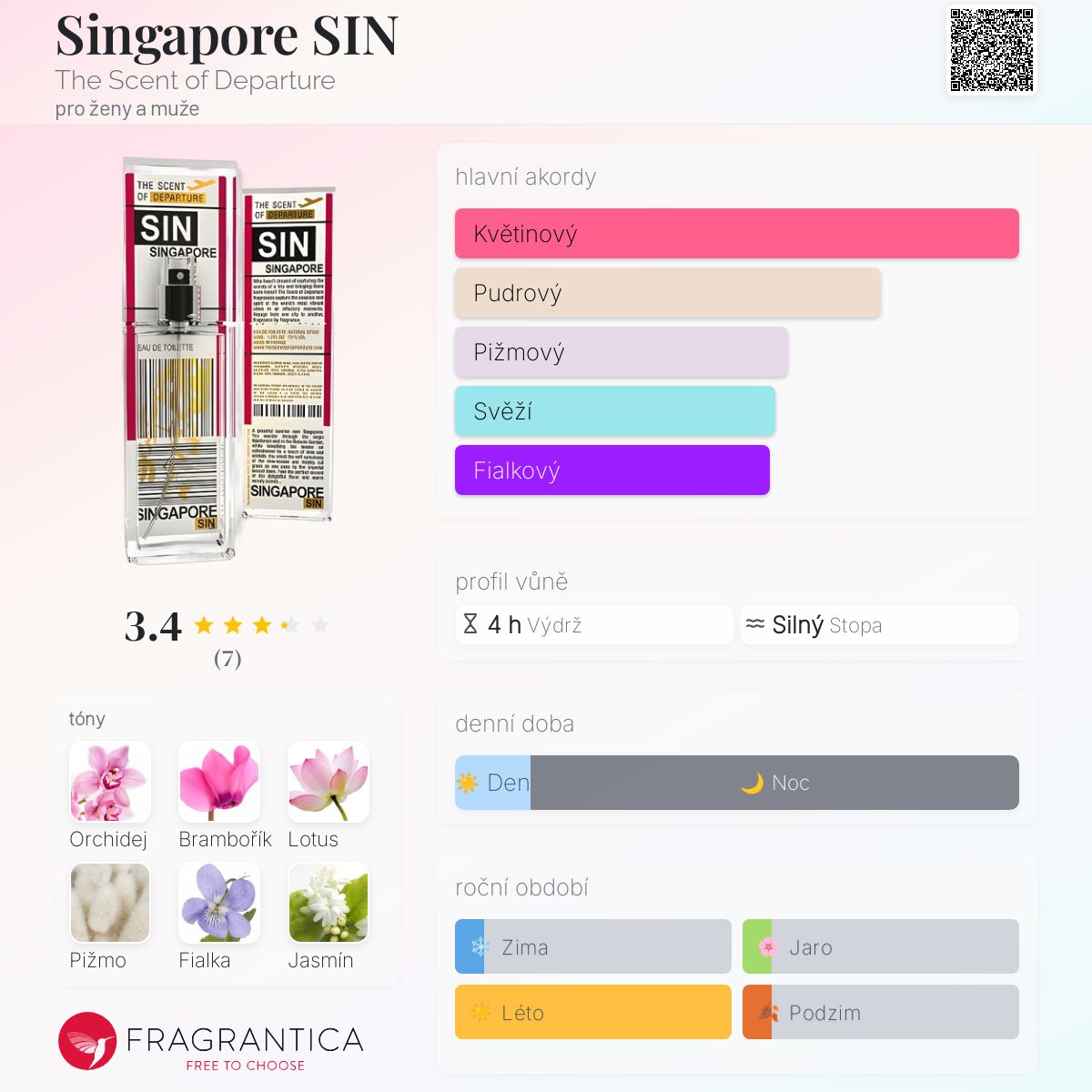 Singapore SIN podle The Scent of Departure je Floral Woody Musk vůně pro ženy a muže. Singapore SIN byl/a uveden/a v roce 2012. Vrchní tóny jsou Orchidej a Lotus; střední tóny jsouBrambořík, Lotus, Fialka a Jasmín ; základní tóny jsou Bílé pižmo a Santalové dřevo.