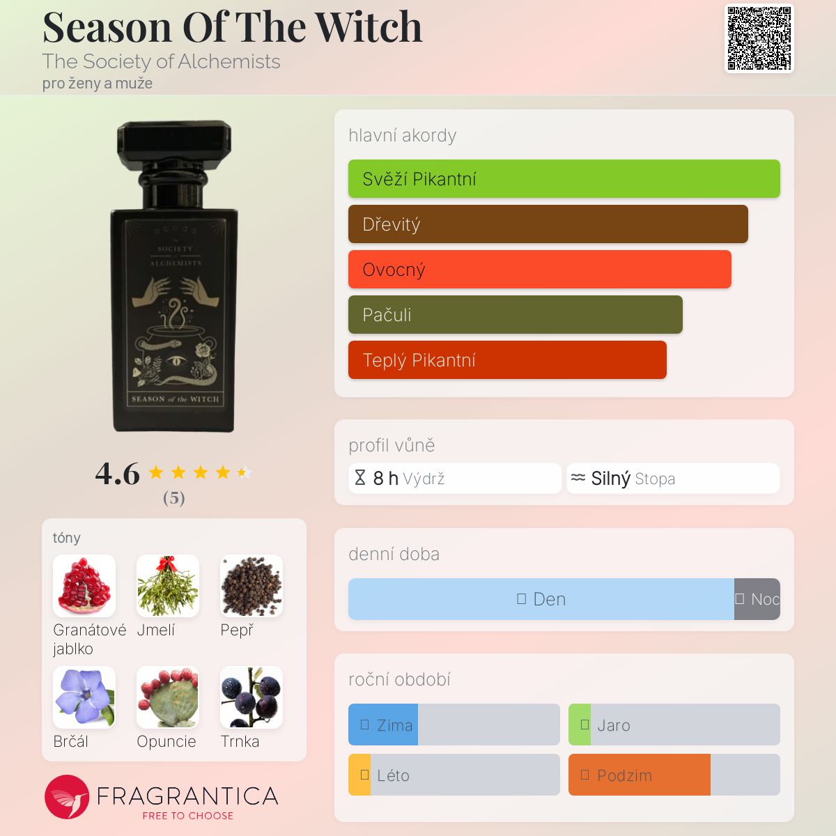 Season Of The Witch podle The Society of Alchemists je vůně pro ženy a muže. Vrchní tóny jsou Granátové jablko a Jmelí; střední tóny jsouČerný pepř a Brčál ; základní tóny jsou Opuncie, Trnka a Pačuli.