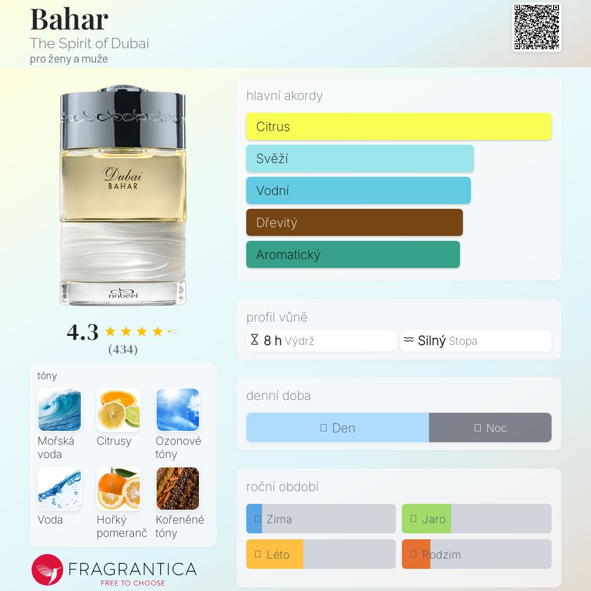 Bahar podle The Spirit of Dubai je Orientální Woody vůně pro ženy a muže. Bahar byl/a uveden/a v roce 2015. Vrchní tóny jsou Mořské tóny, Citrusy, Ozonové tóny, Vodnaté tóny, Hořký pomeranč, Kořeněné tóny, Zázvor, Limetka, Grapefruit, Fialkové listy, Citrón, Jablko, Kokos, Černý rybíz, Zelené tóny, Ananas, Jahoda, Švestka, Kardamom, Třešeň, Mandarinka a Maliny; střední tóny jsouKoření, Fialkový list, Santalové dřevo, Lotus, Brambořík, Jasmín, Cedr, Vanilka, Růže, Jedle, Kašmírové dřevo, Šafrán a Kosatec ; základní tóny jsou Santalové dřevo, Vzácné dřevo, Vetiver, Jantar (ambra), Pižmo, Vanilka, Agarové dřevo (oud), Pačuli a Slaměnka.