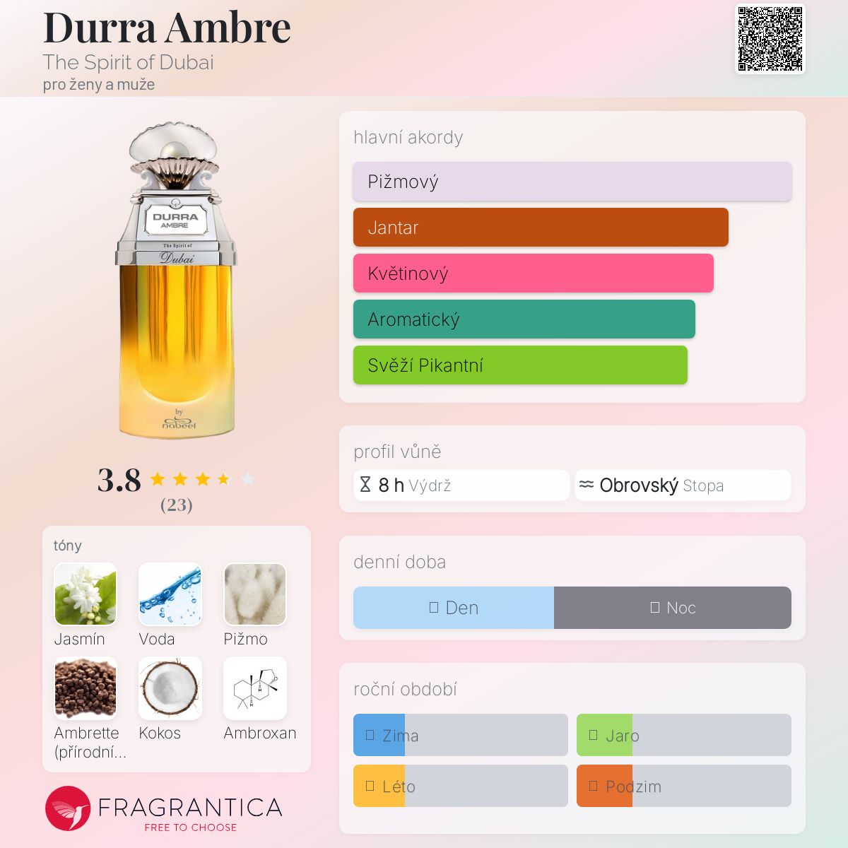 Durra Ambre podle The Spirit of Dubai je Orientální Floral vůně pro ženy a muže. Toto je nová vůně. Durra Ambre byl/a uveden/a v roce 2024. Vrchní tóny jsou Vodní tóny, Ambrette (přírodní pižmo), Růžový pepř, Elimi, Olibanum, Jantar (ambra), Černý pepř, Broskev, Grapefruit, Šafrán, Růže, Šalvěj a Bergamot; střední tóny jsouJasmín Sambac, Kokos, Pelargónie, Magnólie, Frézie, Konvalinka, Med, Čajová růže, Kůže, Karamel a Růže ; základní tóny jsou Pižmo, Ambroxan, Pačuli, Jantar (ambra), Santalové dřevo, Vetiver, Kašmír, Vanilka, Kůže, Gurjanský balzám a Cypriolový olej.