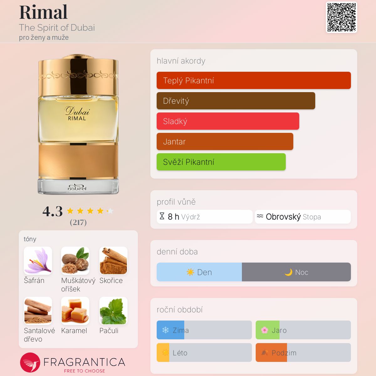 Rimal podle The Spirit of Dubai je Orientální Spicy vůně pro ženy a muže. Rimal byl/a uveden/a v roce 2015. Vrchní tóny jsou Šafrán, Muškátový oříšek, Skořice, Ovoce, Vanilka, Bílé květy a Bergamot; střední tóny jsouPačuli, Sladké tóny, Kadidlo, Ylang-Ylang, Styrax a Růže ; základní tóny jsou Santalové dřevo, Karamel, Kůže, Agarové dřevo (oud), Jantar (ambra), Vetiver, Labdanum a Pižmo.