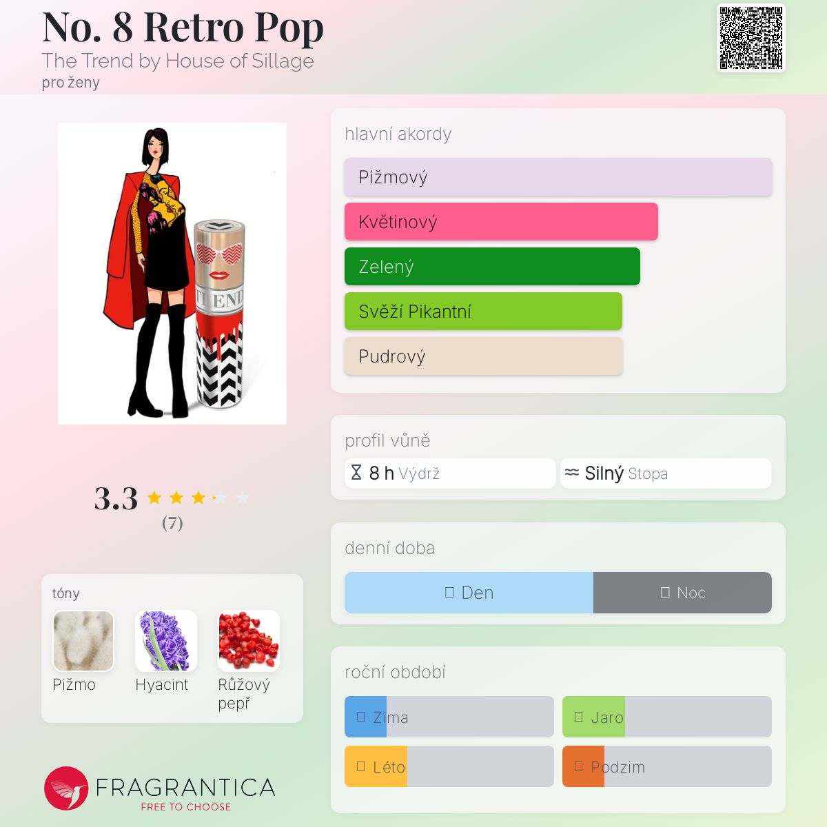 No. 8 Retro Pop podle The Trend by House of Sillage je Aromatic Spicy vůně pro ženy. No. 8 Retro Pop byl/a uveden/a v roce 2016. Vrchní tón je Růžový pepř ; střední tón jeHyacint ; základní tón je Bílé pižmo.