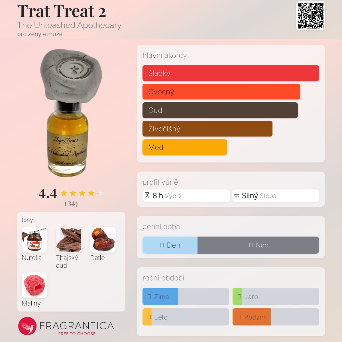 Trat Treat 2 podle The Unleashed Apothecary je Woody Aromatic vůně pro ženy a muže. Trat Treat 2 byl/a uveden/a v roce 2023. "Nosem" za touto vůní je Jimmy Bodin. Vrchní tón je Maliny ; střední tóny jsouNutella a Datle ; základní tón je Thajský oud.