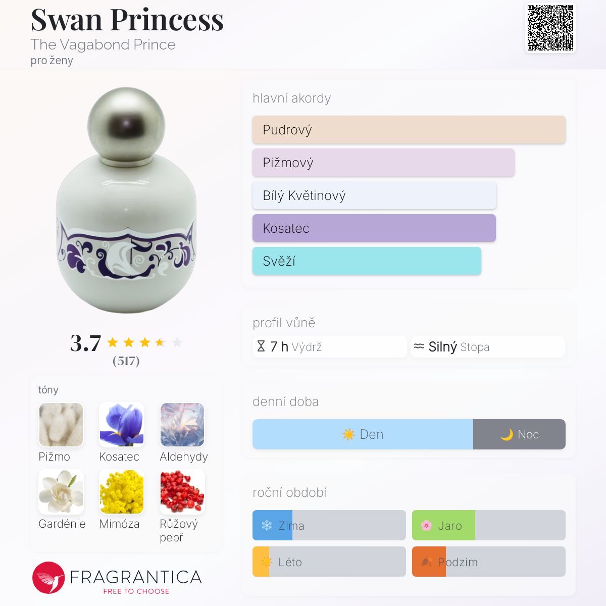 Swan Princess podle The Vagabond Prince je Floral Woody Musk vůně pro ženy. Swan Princess byl/a uveden/a v roce 2014. "Nosem" za touto vůní je Bertrand Duchaufour. Vrchní tóny jsou Aldehydy, Růžový pepř a Bergamot; střední tóny jsouKosatec, Gardénie, Mimóza, Konvalinka, Pivoňka, Marocká růže a Jasmín ; základní tóny jsou Pižmo, Santalové dřevo a Vetiver.