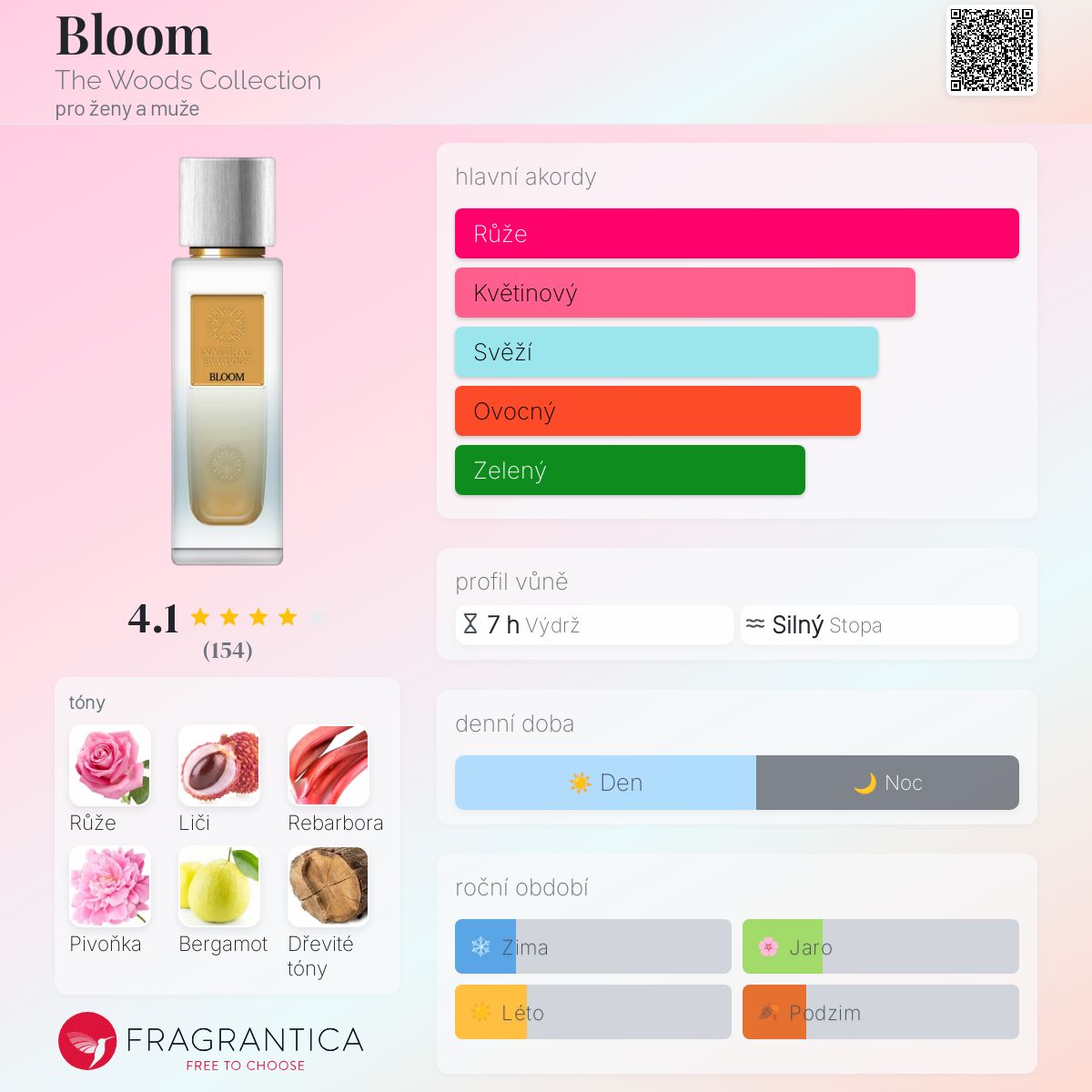 Bloom podle The Woods Collection je vůně pro ženy a muže. Bloom byl/a uveden/a v roce 2020. Vrchní tóny jsou Liči, Rebarbora, Bergamot a Muškátový oříšek; střední tóny jsouTurecká růže, Pivoňka a Konvalinka ; základní tóny jsou Dřevité tóny, Bílé pižmo, Vanilka, Kašmír a Kadidlo.