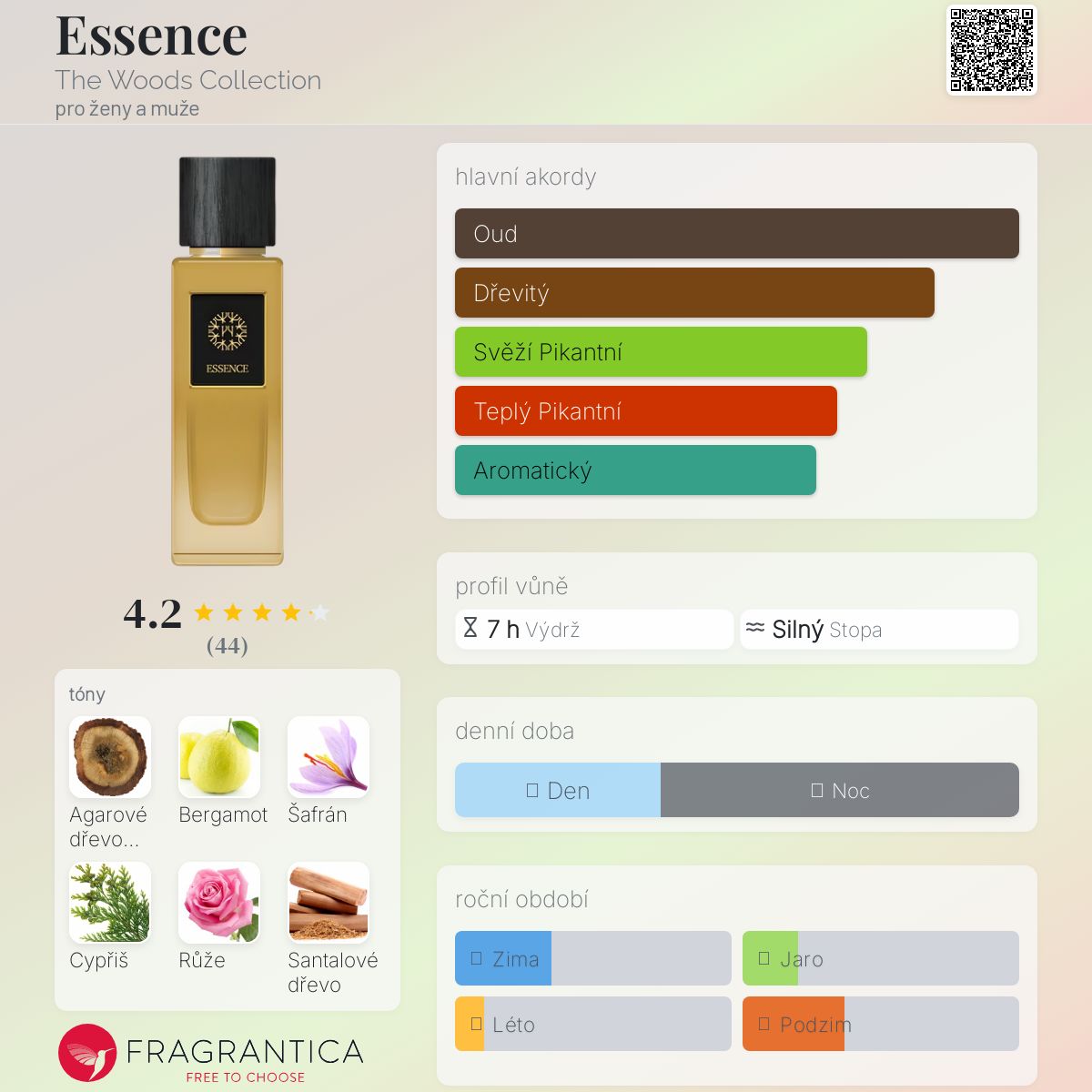 Essence podle The Woods Collection je vůně pro ženy a muže. Essence byl/a uveden/a v roce 2023. Vrchní tóny jsou Bergamot, Šafrán, Cypřiš a Kardamom; střední tóny jsouBulharská růže, Jasmín a Muškátový oříšek ; základní tóny jsou Agarové dřevo (oud), Agarové dřevo (oud), Santalové dřevo, Vanilka, Kůže, Jantar (ambra), Cedr, Fazole tonka a Pižmo.