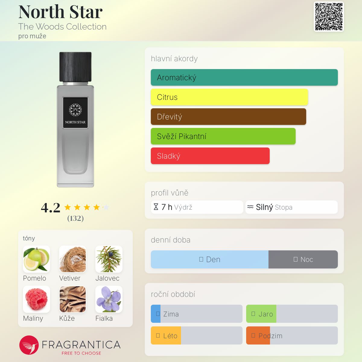 North Star podle The Woods Collection je Orientální Floral vůně pro muže. North Star byl/a uveden/a v roce 2021. Vrchní tóny jsou Pomelo a Maliny; střední tóny jsouJalovec, Fialka a Růže ; základní tóny jsou Vetiver a Kůže.