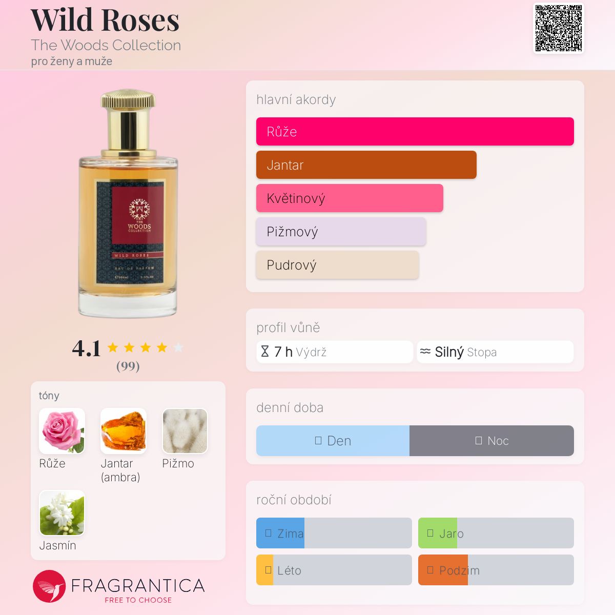 Wild Roses podle The Woods Collection je Orientální Woody vůně pro ženy a muže. Wild Roses byl/a uveden/a v roce 2016. Vrchní tón je Růže ; střední tóny jsouJantar (ambra) a Pižmo ; základní tón je Jasmín.