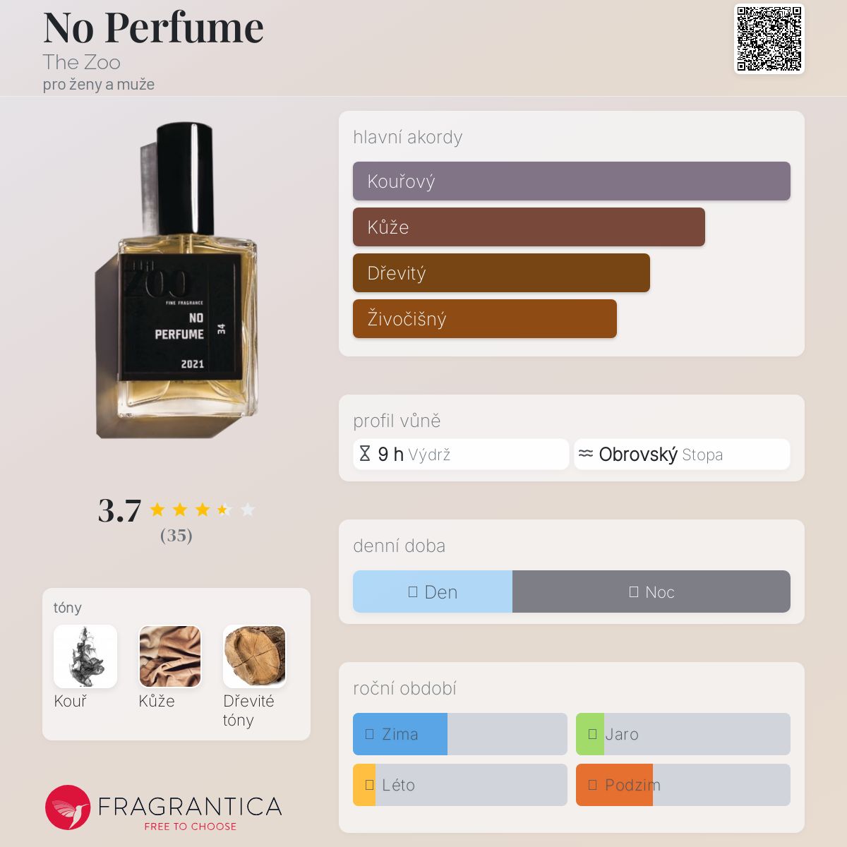 No Perfume podle The Zoo je Woody vůně pro ženy a muže. No Perfume byl/a uveden/a v roce 2021. "Nosem" za touto vůní je Christophe Laudamiel.