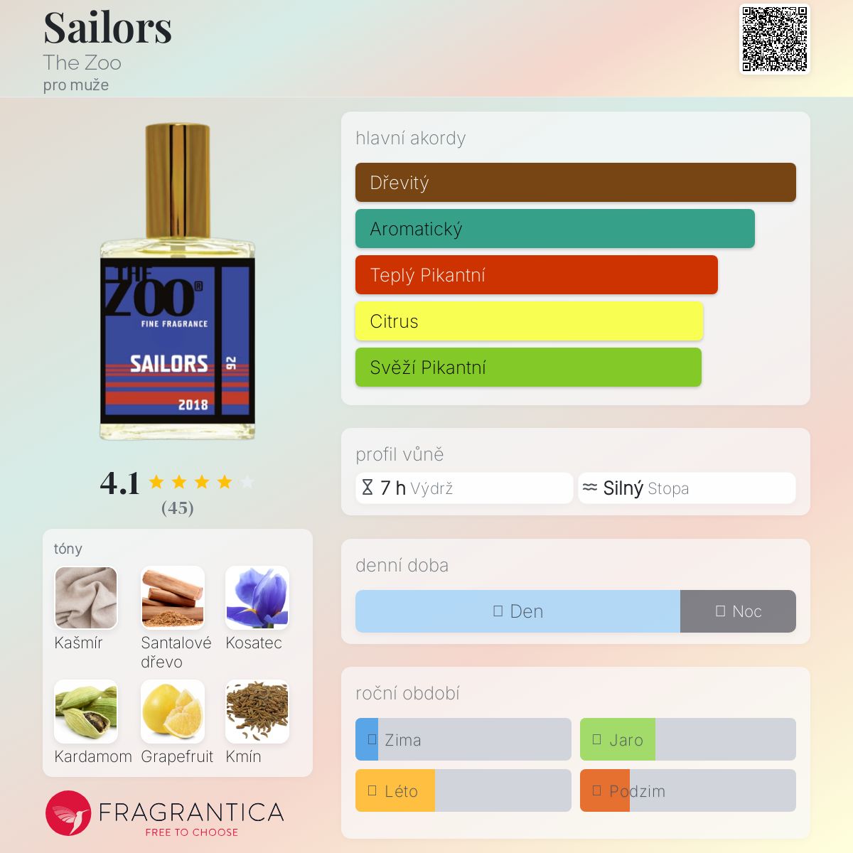 Sailors podle The Zoo je vůně pro muže. Sailors byl/a uveden/a v roce 2018. "Nosem" za touto vůní je Christophe Laudamiel. Vrchní tóny jsou Grapefruit, Kmín, Pelyněk, Bříza, Neroli, Koriandr, Mandarinka, Fialkový list, Bergamot, Hořký pomeranč a Citrón; střední tóny jsouKosatec, Kardamom, Jasmín, Jalovec, Skořice, Kořen orris, Zázvor a Pepř ; základní tóny jsou Kašmír, Santalové dřevo, Mořská řasa, Čaj, List skořice, Cedr, Kůže, Tahitský vetiver, Jantar (ambra), Dubový mech, Hřebíček a Wolfwood.